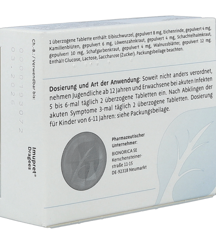 Imupret® sollte unzerkaut und am besten mit etwas Flüssigkeit, z.B. einem Glas Wasser, eingenommen werden. Personen ab 12 Jahren: Akut: 5 – 6mal tgl. 2 Dragees, nach Abklingen der akuten Symptome 3mal tgl. 2 Dragees. Kinder (6-11 Jahre): 5 - 6mal tgl. 1 Dragee, nach Abklingen der akuten Symptome 3mal tgl. 1 Dragee. Für Kinder unter 6 Jahren nicht empfohlen.