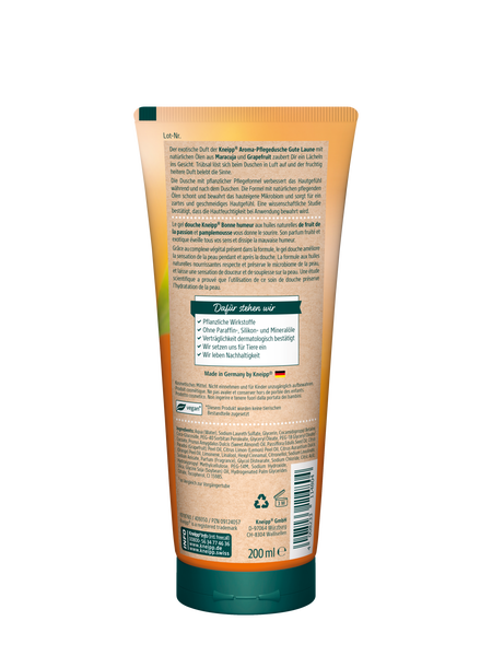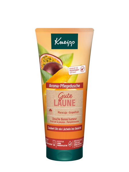 Der exotische Duft der Kneipp® Aroma-Pflegedusche Gute Laune mit natürlichen Ölen aus Maracuja und Grapefruit zaubert Dir ein Lächeln ins Gesicht. Trübsal löst sich beim Duschen in Luft auf und der fruchtig heitere Duft belebt die Sinne.