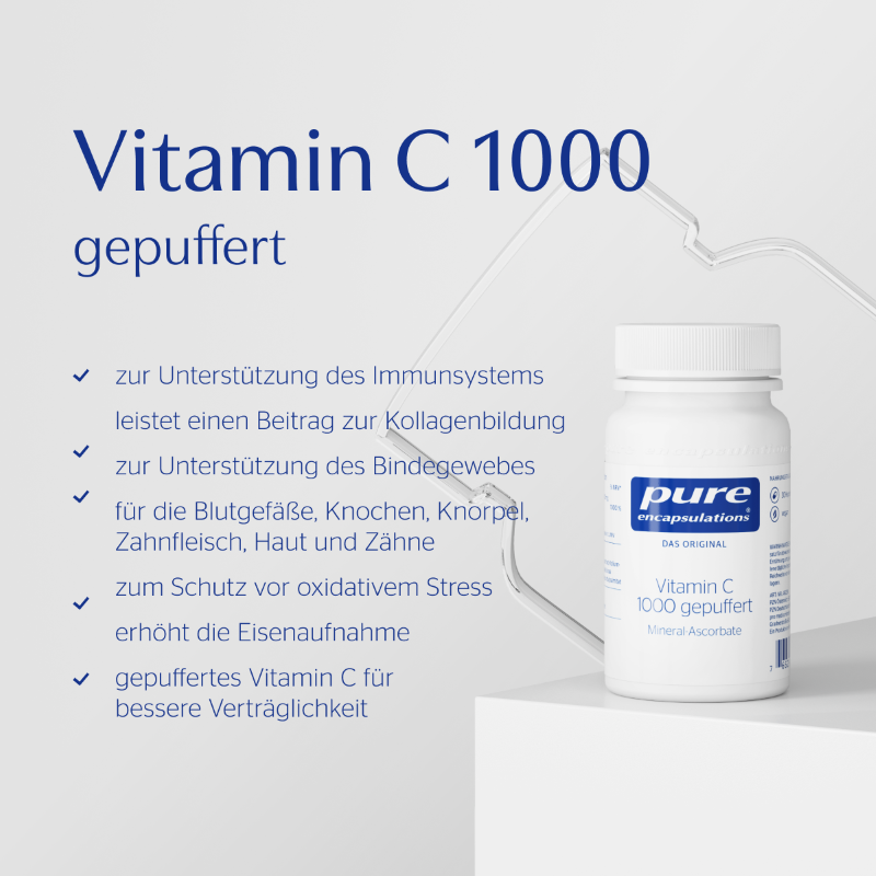 Um in besonderen Phaseneinen erhöhten Bedarf an Vitamin C zu decken, kann es daher sinnvoll sein, den Körper über den normalen Tagesbedarf hinaus mit Nahrungsergänzungsmitteln zu unterstützen. Die Vitamin C Kapseln von Pure Encapsulations® liefern zu diesem Zweck 1000 mg hochwertiges Vitamin C in nur einer Kapsel täglich.