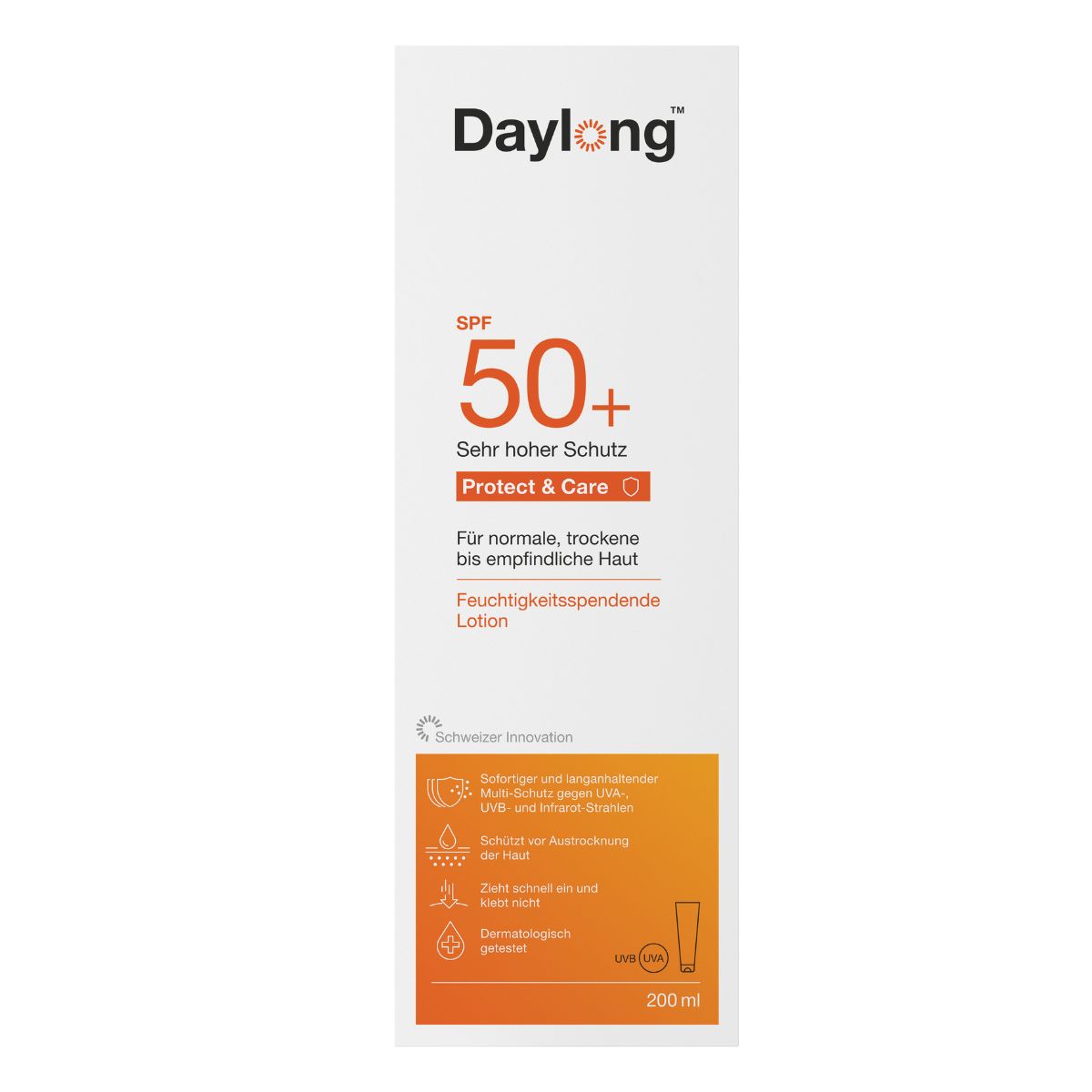 Starker und komfortabler Schutz – die Daylong liposomale Lotion SPF 50+. Photostabile Breitbandfilter schützen die Haut vor UVA-, UVB- und IR-Strahlen und beugen damit auch Hautalterung vor. Die Filter verteilen sich besonders schnell und gleichmässig in der Haut dank der liposomalen Zusammensetzung (hautähnlicher Aufbau der Moleküle). Die Sonnenlotion zieht schnell ein. Dank Aloe Vera und Vitamin E spendet die nicht fettende Lotion Ihrer Haut Feuchtigkeit über 24 Stunden – eine zusätzliche Feuchtigkeitspflege ist also nicht notwendig.