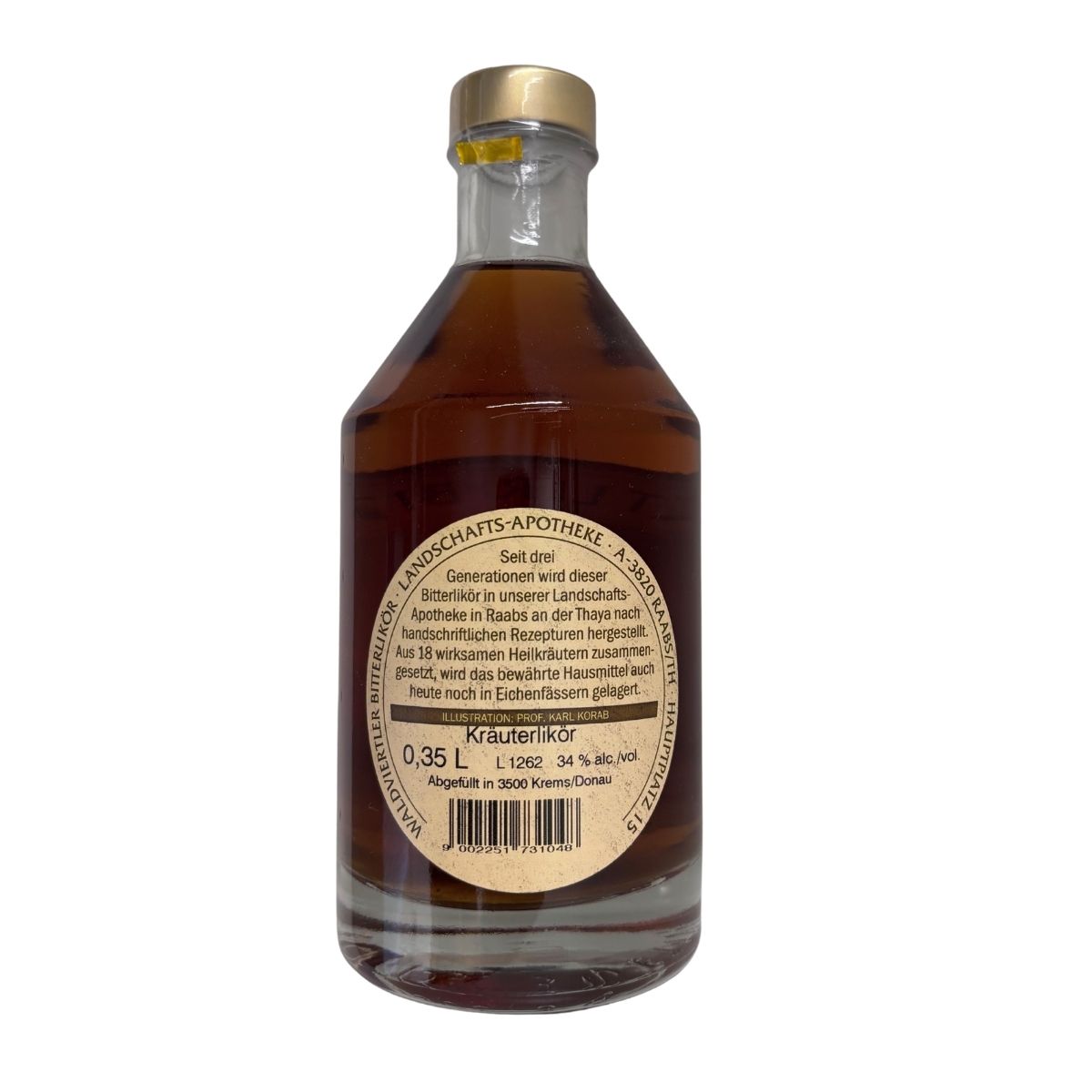 Ein von Generationen vererbtes Familienrezept von 18 verschiedenen Heilkräutern bildet die Basis des Waldviertler Bitterlikörs. Weiters enthalten: Zucker, 32,7% alc/vol.