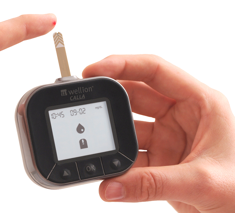 Einfach messen: Stecken Sie den Wellion CALLA Blutzuckerteststreifen in den Teststreifeneinschub und das Wellion CALLA Light Messgerät schaltet sich automatisch ein. Mit einer frischen Lanzette und der Wellion Stechhilfe gewinnen Sie einen kleinen Blutstropfen, den Sie von der Teststreifenspitze in die Reaktionszone einsaugen lassen. Dort wird aus diesem Tropfen der aktuelle Blutzuckerwert gemessen. Nach dem Countdown zeigt das Wellion CALLA Blutzuckermessgerät das Resultat in großen Ziffern am beleuchteten Display an.
