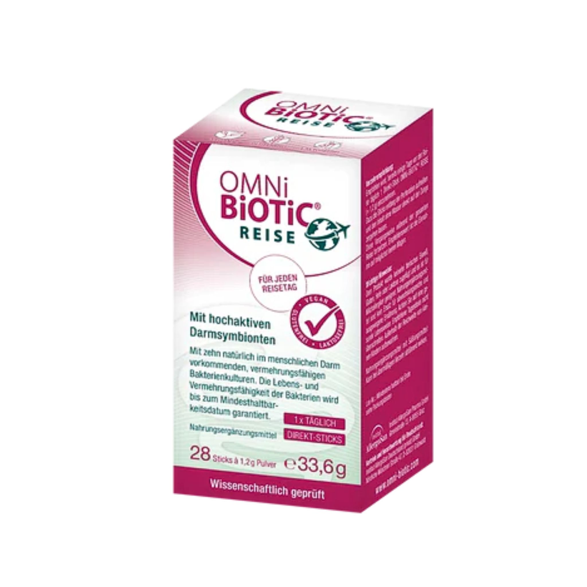 In OMNi-BiOTiC® REISE sorgen zehn speziell ausgewählte Bakterienstämme und die hohe Anzahl von 5 Milliarden hochaktiven „Helfern“ (Darmbakterien) pro Portion dafür, dass Sie jeden Tag Ihrer Reise genießen können. Eine herausragende Besonderheit von OMNi-BiOTiC® REISE ist die Matrix, in welche die Bakterien eingebettet sind: Enzyme und Ballaststoffe kurbeln die Aktivität der synbiotischen Helfer massiv an und garantieren deren Überleben in der feindlichen Umgebung von Magen und Zwölffingerdarm – ganz ohne chemische Hilfsmittel wie Kapsel oder Lackierungen.