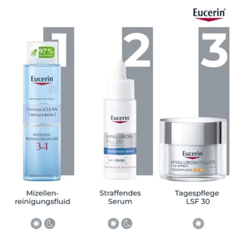 Zur Vervollständigung Ihrer Anti-Aging-Routine empfiehlt Eucerin: - Hyaluron-Filler +3x Effect Tagespflege LSF 30 morgens für Feuchtigkeit und UV-Schutz. - Hyaluron-Filler +3x Effect Straffende Nachtpflege abends zur Unterstützung der nächtlichen Regeneration.