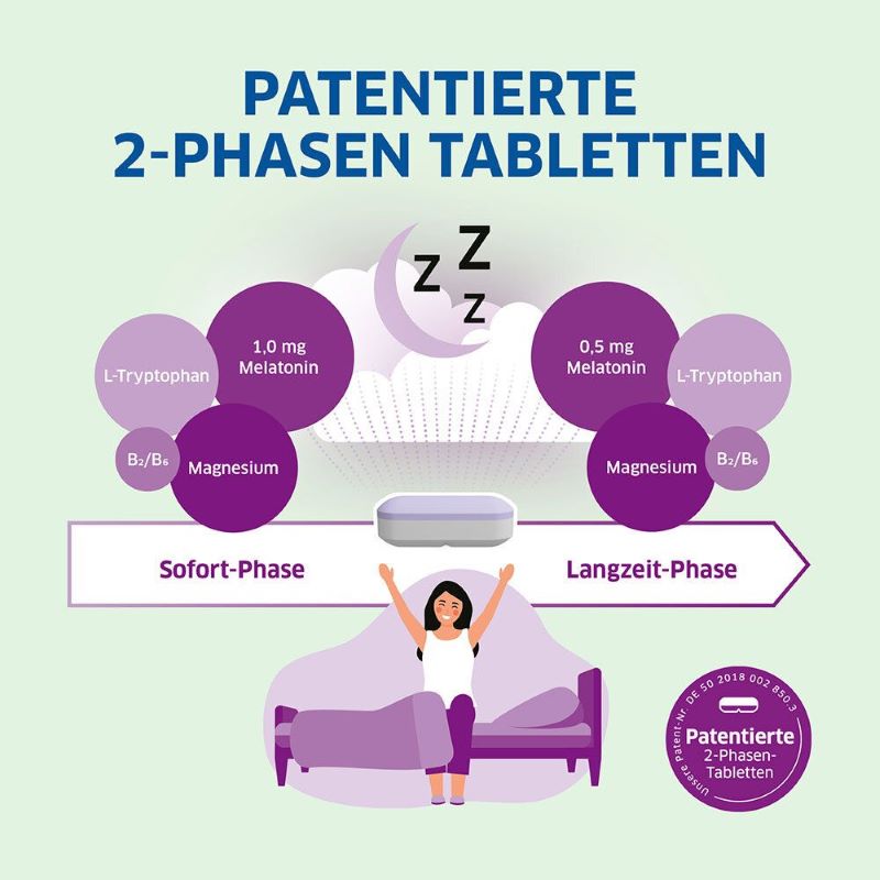 Magnesium, Vitamin B2 und B6 tragen zur normalen Funktion der Nerven und Energiestoffwechsel bei. Magnesium und Vitamin B6 tragen zur normalen psychischen Funktion bei. Magnesium-Diasporal® Pro DEPOT Schneller Einschlafen* ist eine Kombination aus hochdosiertem Magnesium, Melatonin, L-Tryptophan und den Vitaminen B2 und B6. Die patentierte** 2-Phasen-Tablette hat eine Sofort- und Langzeitfreisetzung: In der Sofort-Phase werden Magnesium und 1 mg Melatonin schnell freigesetzt, in der Langzeit-Phase werden Magnesium und weitere 0,5 mg Melatonin zeitverzögert abgegeben.